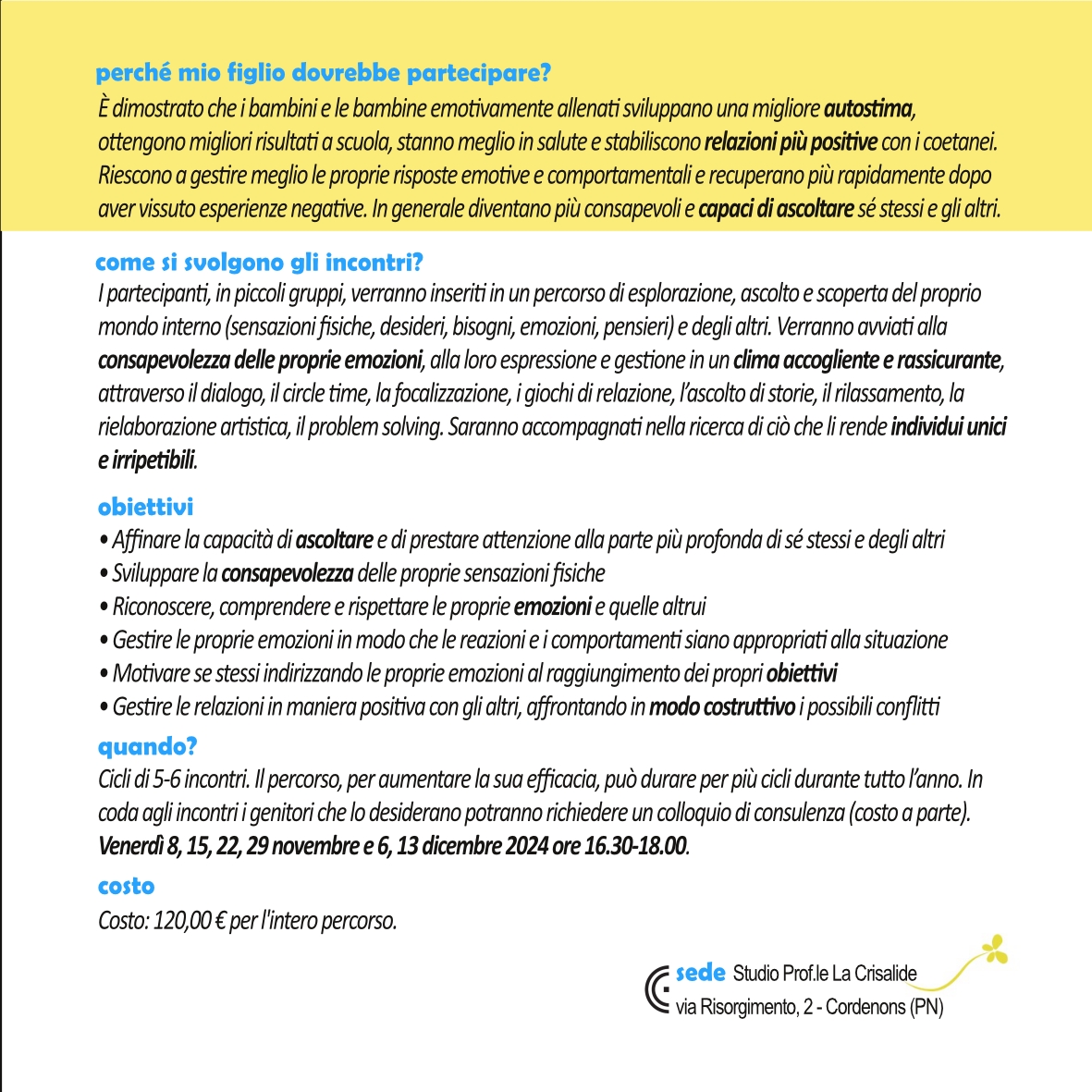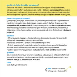 I partecipanti, in piccoli gruppi, verranno inseriti in un percorso di esplorazione, ascolto e scoperta del proprio mondo interno (sensazioni fisiche, desideri, bisogni, emozioni, pensieri) e degli altri. Verranno avviati alla consapevolezza delle proprie emozioni, alla loro espressione e gestione in un clima accogliente e rassicurante, attraverso il dialogo,