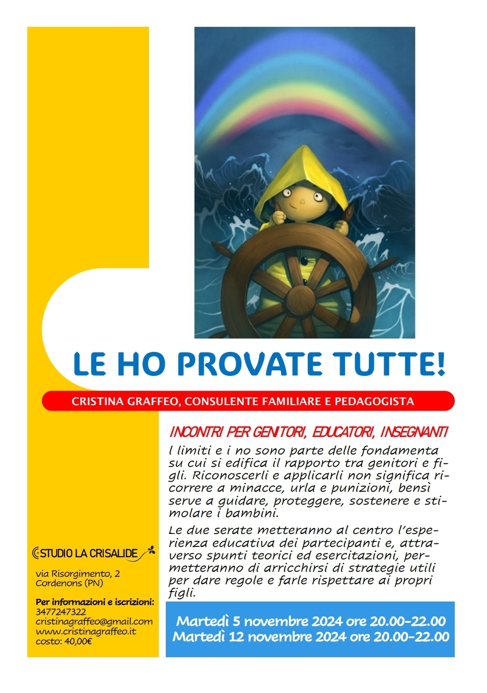 In coda agli incontri i genitori che lo desiderano potranno richiedere un colloquio di consulenza (costo a parte).