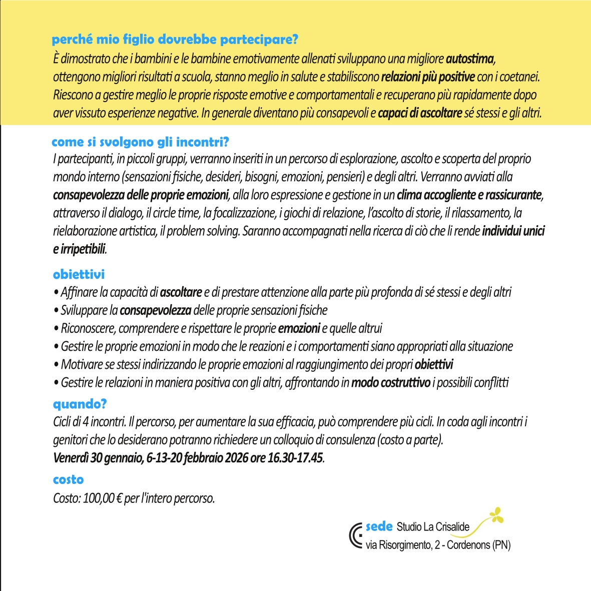Venerdì 30 gennaio 2026 dalle 16.30 alle 17.45 inizierà un nuovo ciclo di incontri di “Crescere in…consapevolezza, emozioni, autostima“.